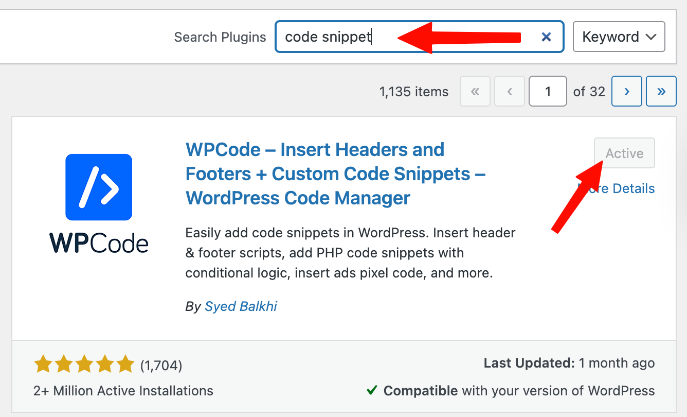 - Search for "code snippet" and install + activate "WPCode"