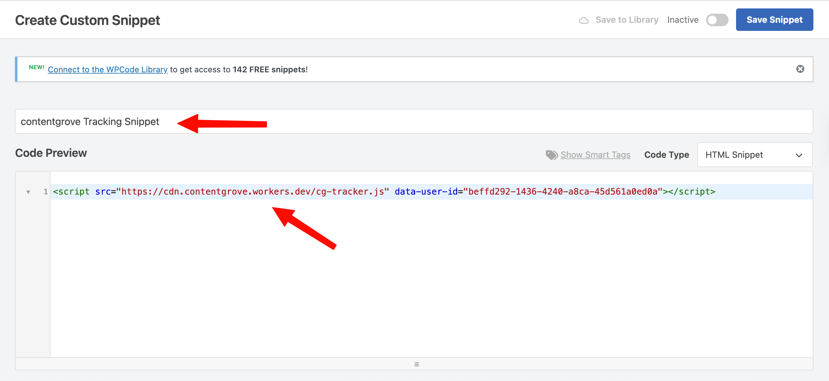 - Enter a title for your snippet and copy the HTML snippet from your contentgrove settings