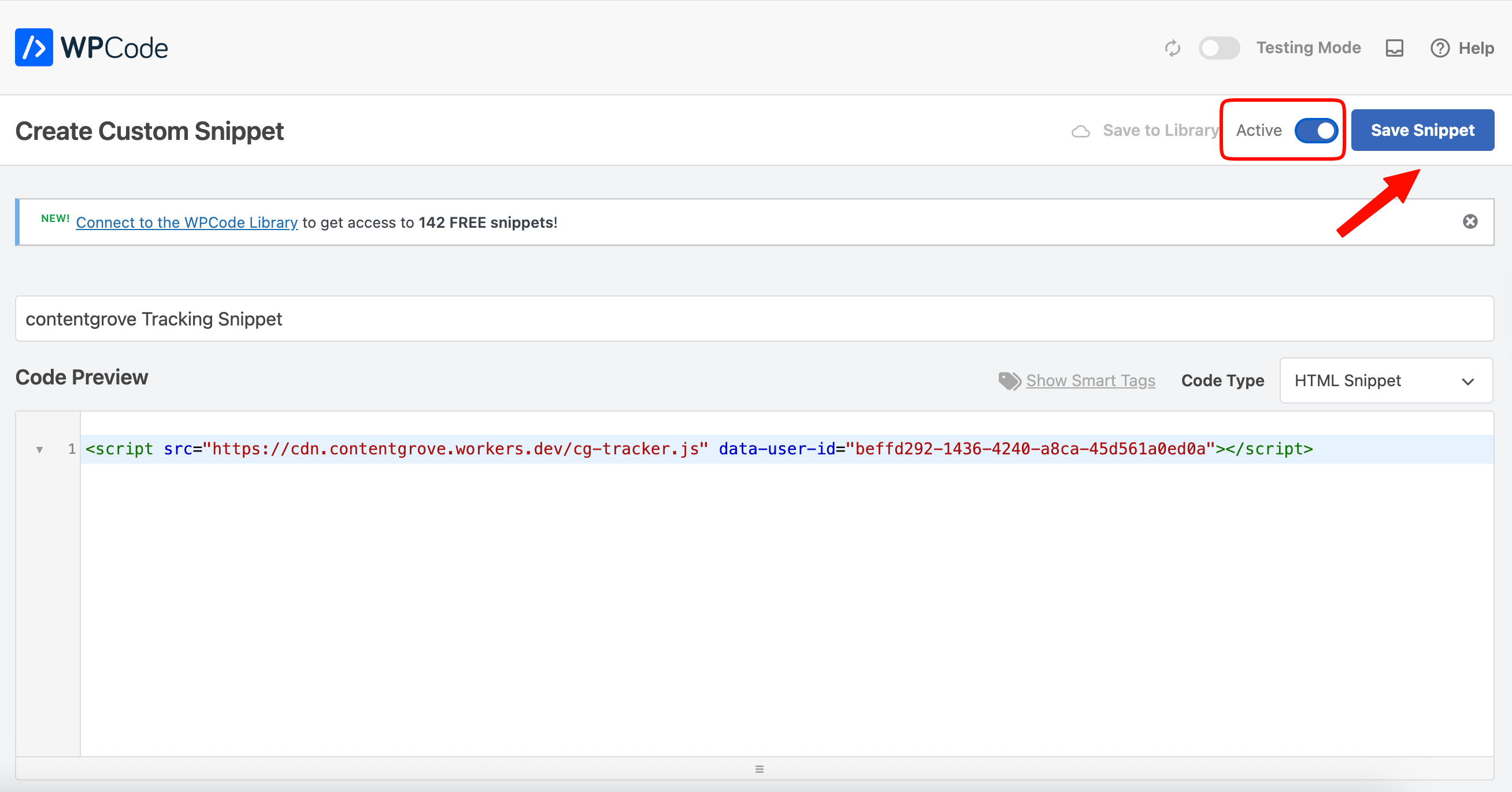 - Set the snippet to Active and click on "Save Snippet"