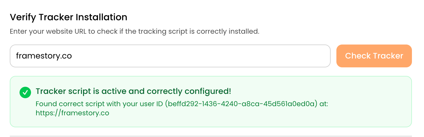 To verify if the snippet is correctly setup, you can go to the contentgrove settings and use the "Verify Tracker" tool. Simply enter the URL of your website and click on "Check Tracker".