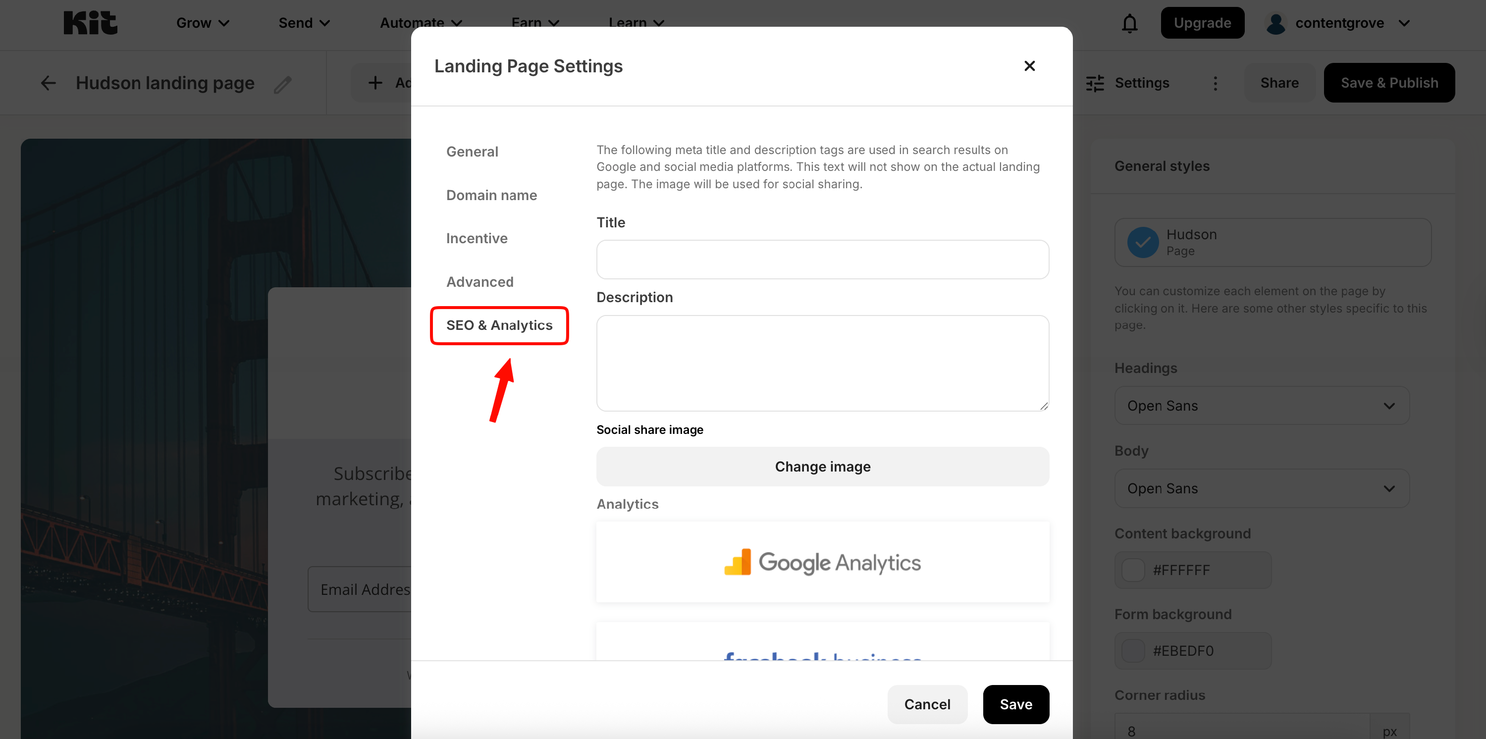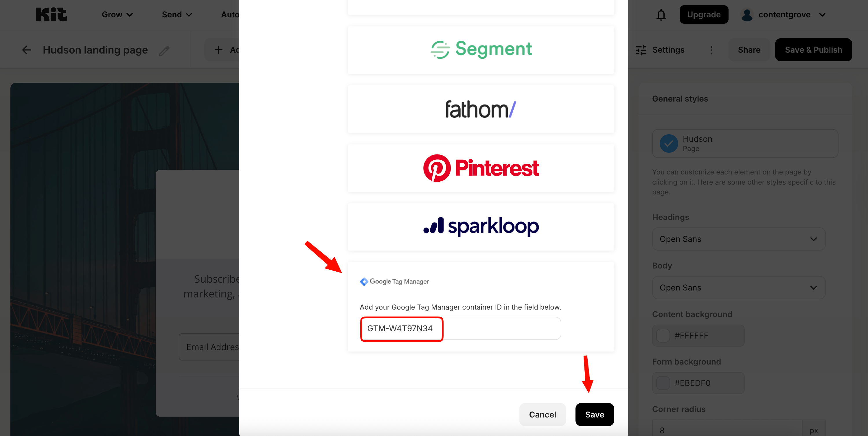 contentgrove supports tracking on Kit landingpages via Kit's GTM (Google Tag Manager) integration. That means you need to setup your GTM account first, you can find a tutorial on that here.