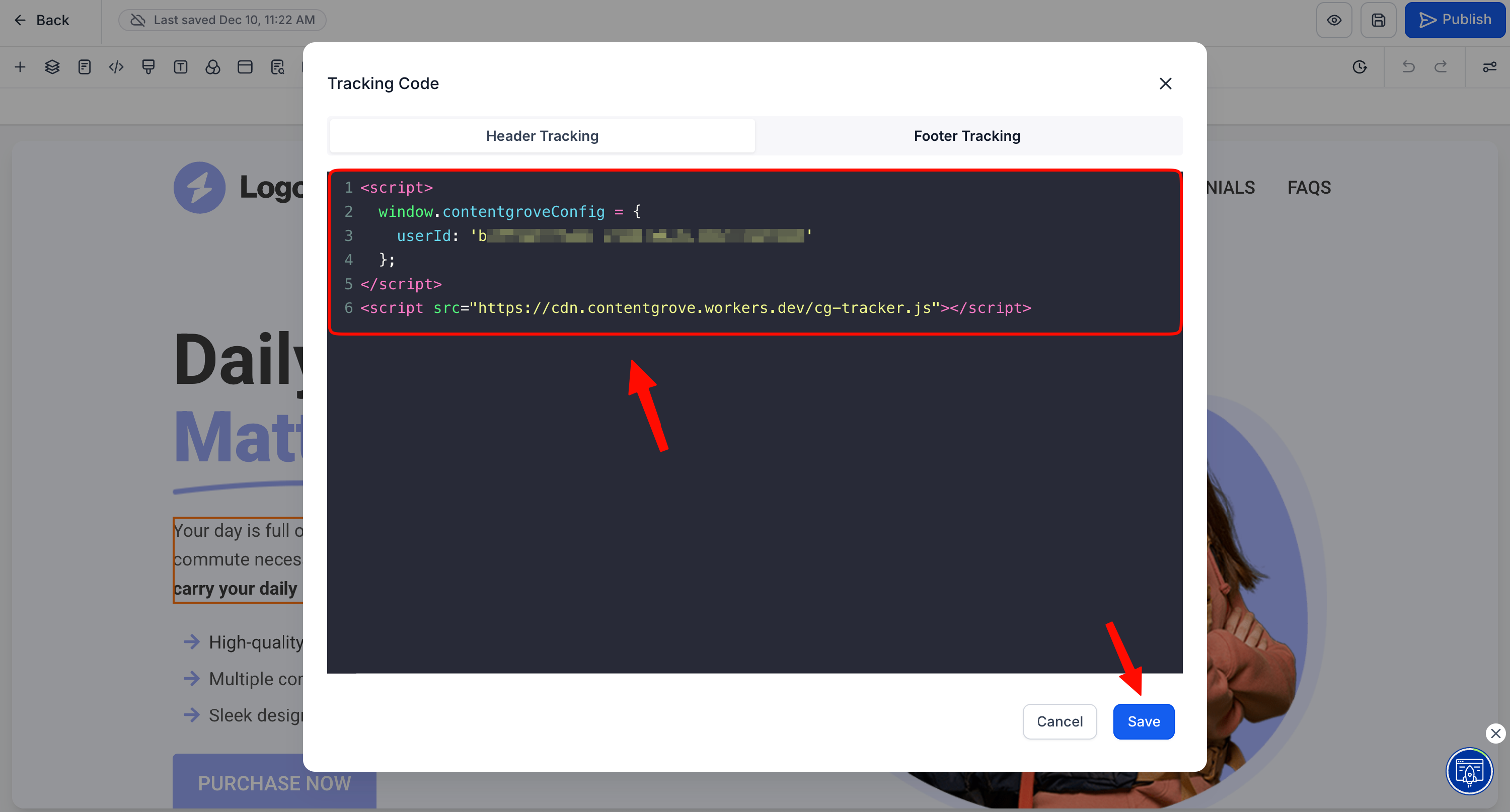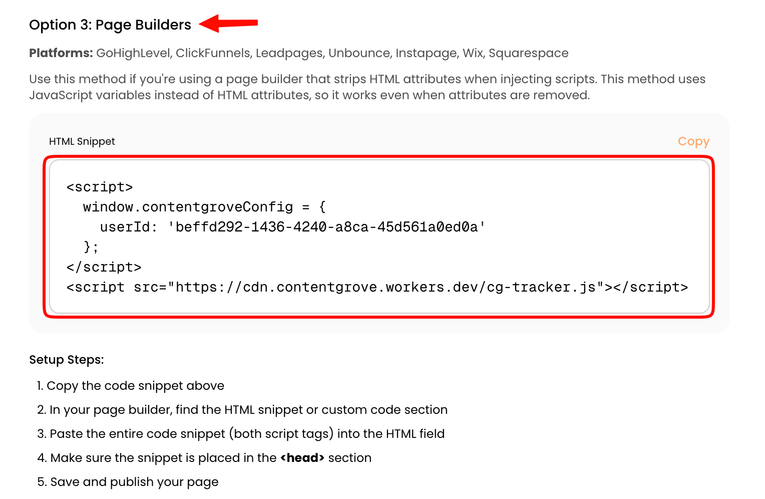 - Copy the tracking snippet for page builders from the contentgrove Settings